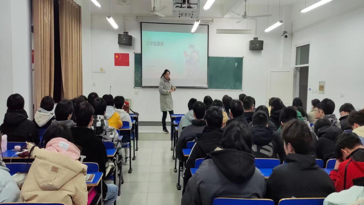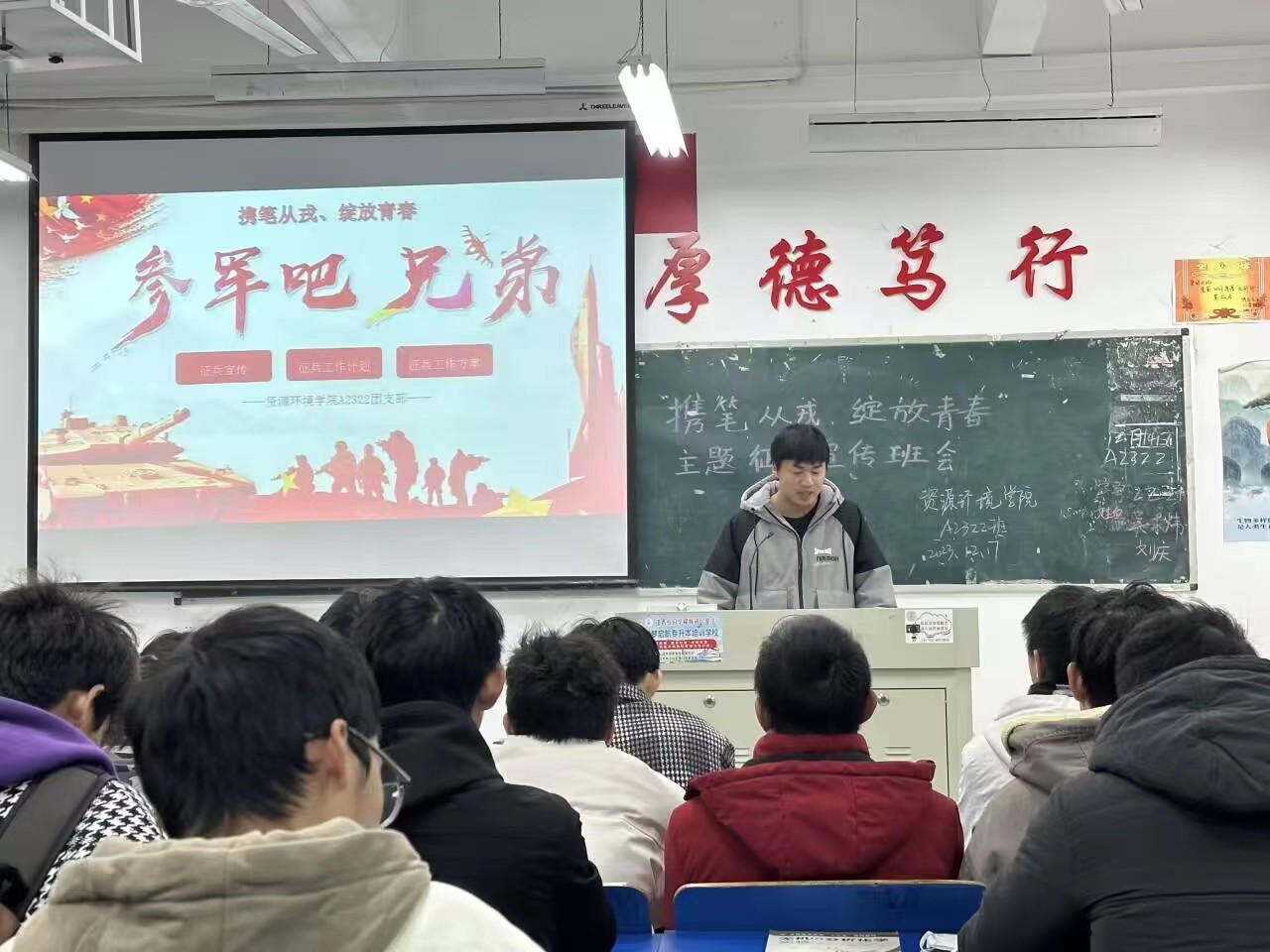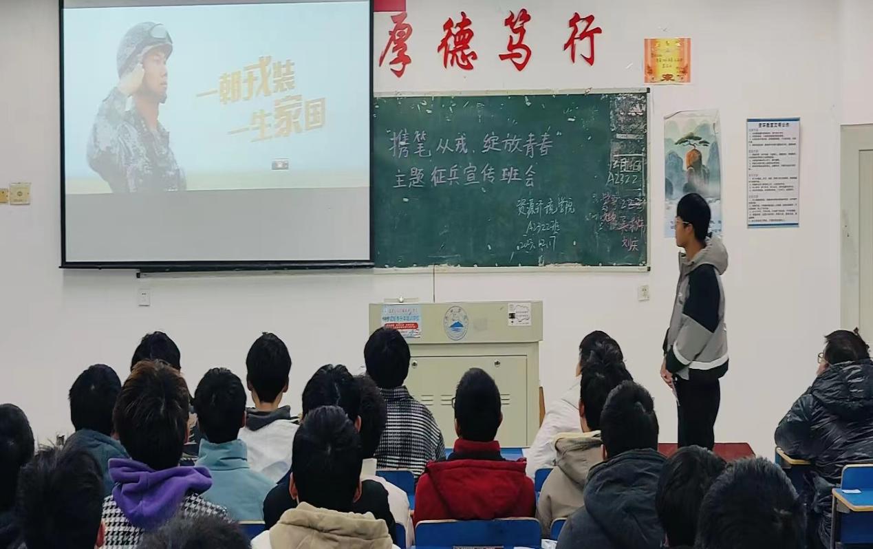为落实kaiyun开云官方《关于组织开展2024届的毕业生“携笔从戎、绽放青春”主题征兵宣传活动的通知》(九院学字[2023]48号)文件精神,进一步激发学生的参军报国热情,kaiyun开云官方于12月18日晚上组织各班级开展了“携笔从戎,绽放青春”主题征兵宣传班会。