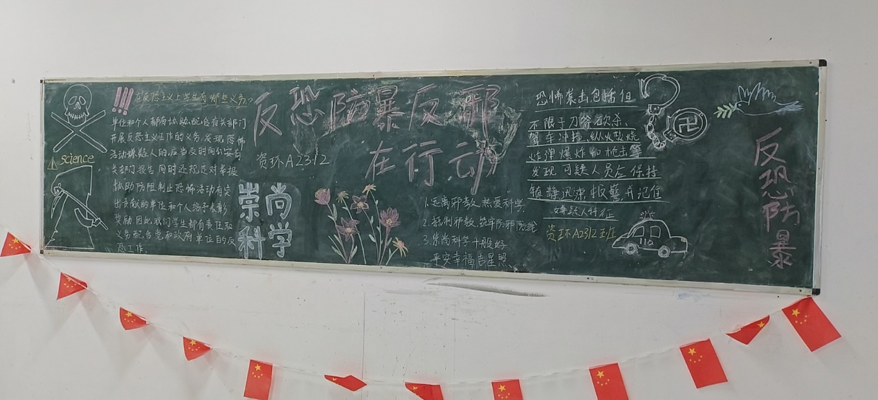 同时为了让此次活动的效果入脑入心,学院还组织学生紧扣主题通过画黑板报的方式,收集了同学们对反恐知识的了解程度和关注点,这对于提高同学们的自我保护意识非常有帮助。他们积极参与、交流想法、互相学习,共同营造了浓厚的学习氛围。