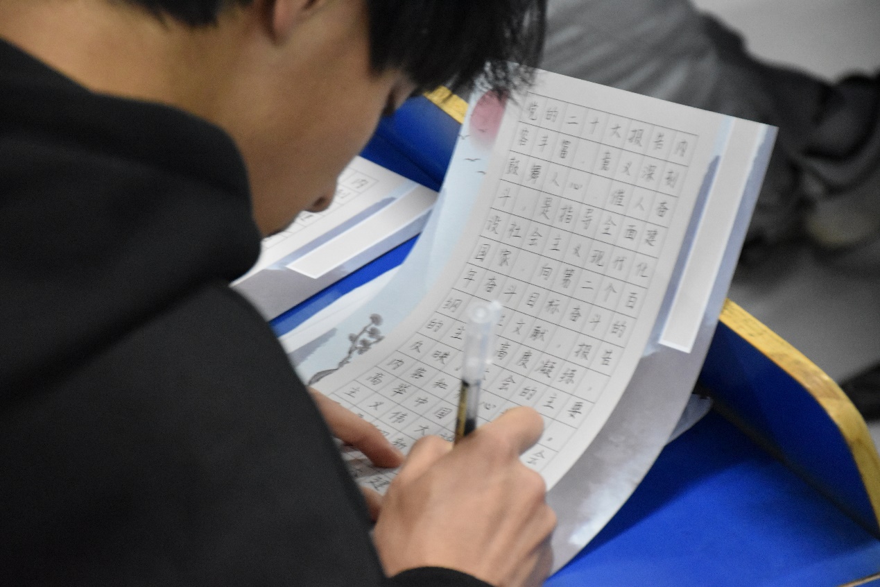 在书法比赛中,选手们心如止水,不急不躁,伴随着悠扬的古琴音乐,提笔写下一个个漂亮的硬笔字,书写内容紧紧围绕党的二十大精神展现主题“翰墨抒情--青春颂百年”。以笔寄情,用墨抒怀,每一份书写作品,让人赏心悦目。