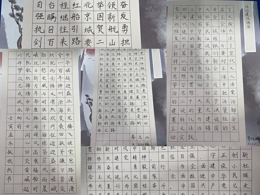 本次活动的开展提高了同学们对书法艺术的学习兴趣,增强了审美能力,丰富了大学生的课余文化生活。同时,身为当代大学生的我们应学习宣传贯彻党的二十大精神,深入领会精神实质,切实做到学深学透、融会贯通,确保党的二十大精神入脑入心、落地落实。