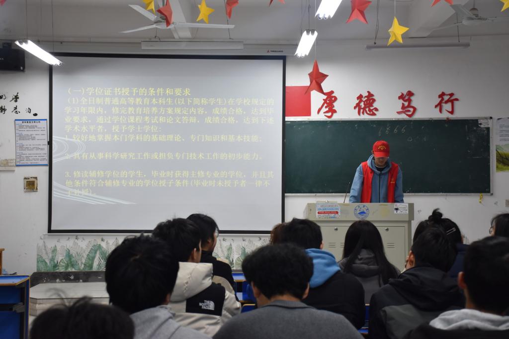在此次宣讲活动中,志愿者分为5组,以ppt口头叙述和视频结合的方式到各个班级进行院风建设的宣传和普及,详细介绍了学生手册的具体内容,并着重对学生综合素质测评方法进行分析讲解。活动有效提升了同学们对学生手册内容的了解,使同学们对学士学位授予条例有了更清晰的认识。