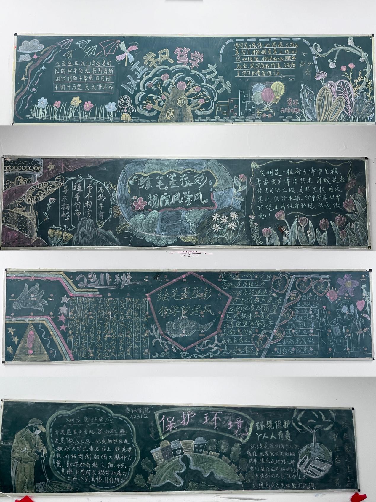 为进一步深化院风学风建设,充分发挥黑板报阵地的育人作用。kaiyun开云官方于2024年4月初在香远楼各班固定教室顺利开展“绘笔墨蕴彩,扬学院风帆”黑板报评比活动。