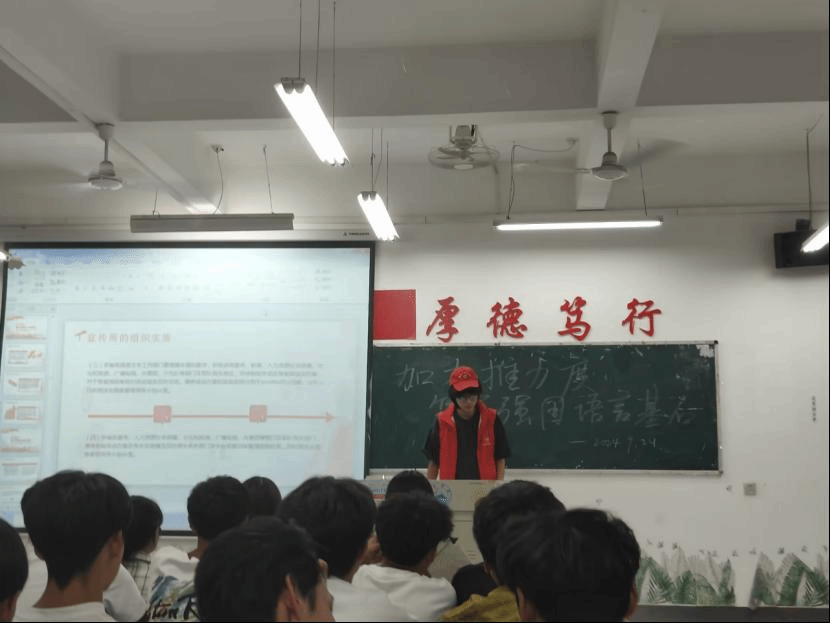 本次宣讲活动得到了广大学生的积极反应,志愿者们组成小队,走进各班教室进行宣讲。志愿者通过图文并茂的PPT、举例分析等形式综合地介绍了推广普通话的必要性,使同学们了解到推广普通话有利于维护国家主权和民族尊严,有利于国家统一和民族团结,有利于社会主义物质文明建设和精神文明建设。