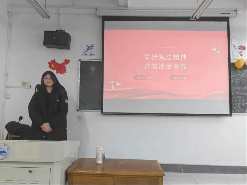 在齐唱团歌结束过后,团日活动准时开始。各班团支书和组织委员组织各班开展“弘扬宪法精神,共筑法治青春”团日活动,主讲人围绕宪法的历史和内容,让同学们认识到了自觉遵守宪法和法律的重要性,极大地增强了团员青年们的宪法意识。