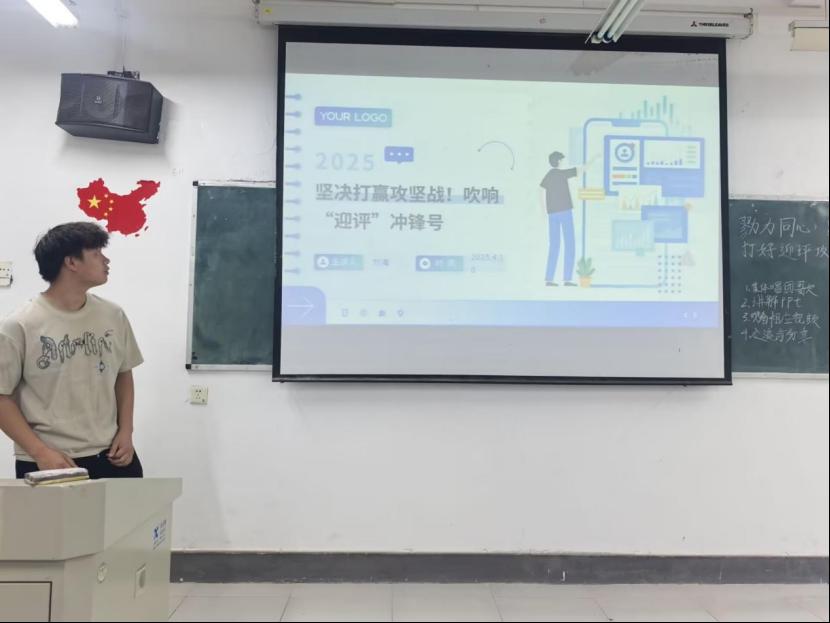 在齐唱团歌结束过后,团日活动准时开始。各班团支书和组织委员组织各班开展“勠力同心,踔厉奋发,打好迎评攻坚战”团日活动,主讲人围绕本科评估的流程和标准,激励团员青年明确目标,为重要评估任务贡献力量,增强责任感与使命感,并号召同学们共同努力,增强集体荣誉感和团队协作意识,营造出积极向上、奋勇攻坚的良好氛围,为迎接评估做好充分准备。