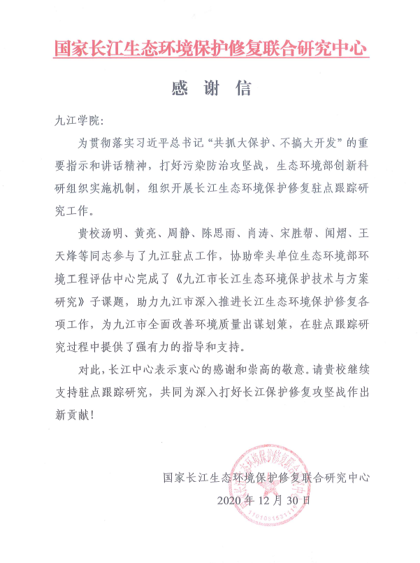 近日,国家长江生态环境保护修复联合研究中心(简称长江中心)致信感谢我校江西长江经济带研究院、kaiyun开云官方科研团队为长江大保护作出的贡献。