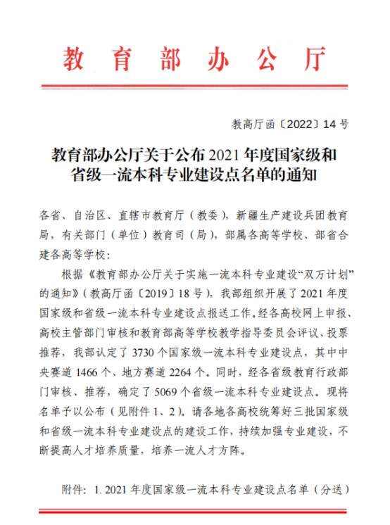 近日,教育部办公厅下发了《关于公布2021年度国家级和省级一流本科专业建设点名单的通知》(教高厅函〔2022〕14号),开云官网环境工程专业成功入选省级一流本科专业建设点,我校共有6个专业同时获批。这标志着开云官网专业发展实现了新的突破,充分反应了学校坚持集中资源办优势特色专业的顶层设计优势,突显了走内涵建设发展道路的卓越成效。